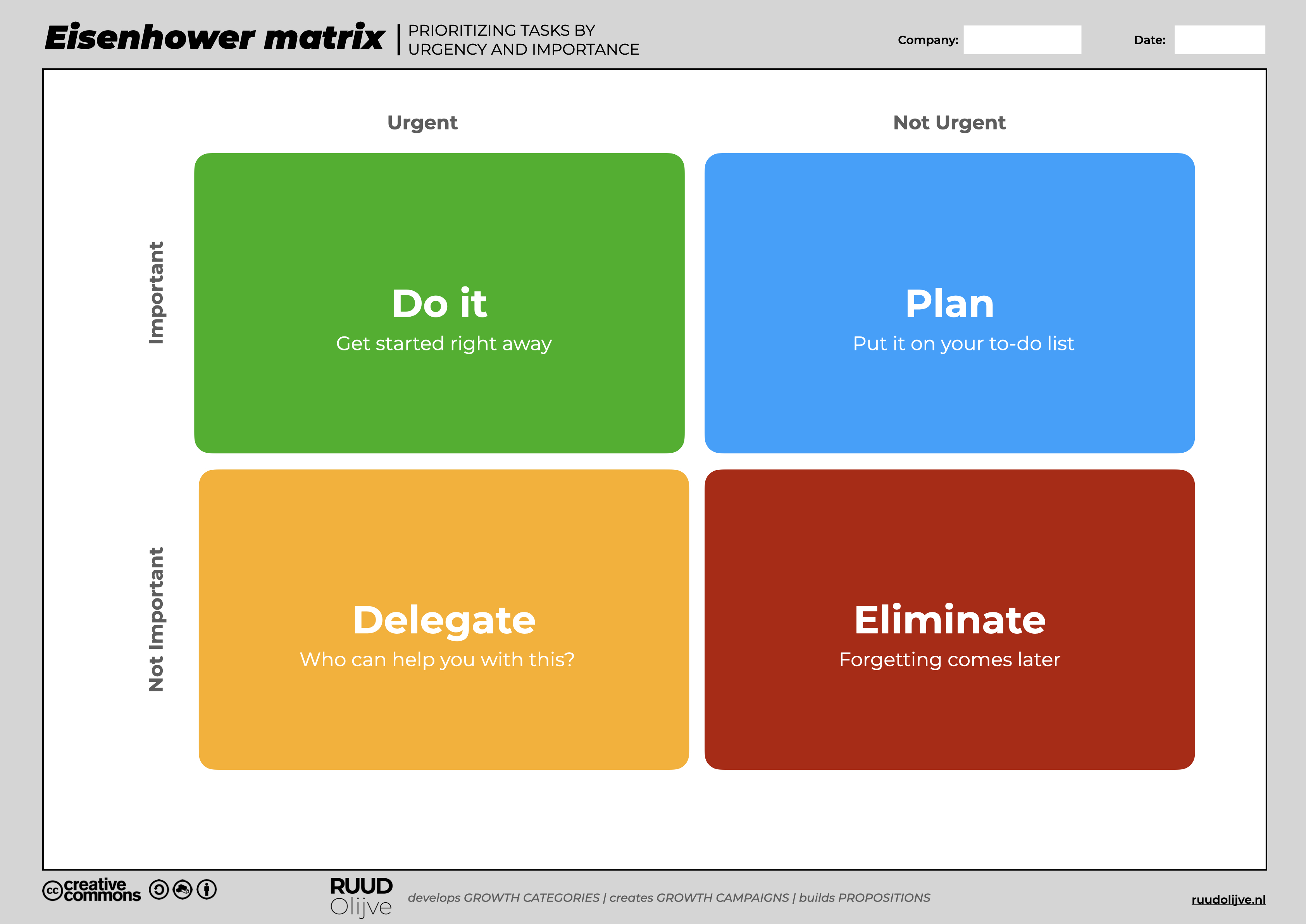 The Eisenhower Matrix helps you to do the right activities (good time management). It gives you more focus and concentration in your work; in short, you work smarter when you complete this tool. This matrix is named after Dwight D. Eisenhower, former president of the United States. He once said, "I have two problems, important problems and urgent problems. The urgent ones are never important, and the important ones are never urgent.' The Eisenhow...