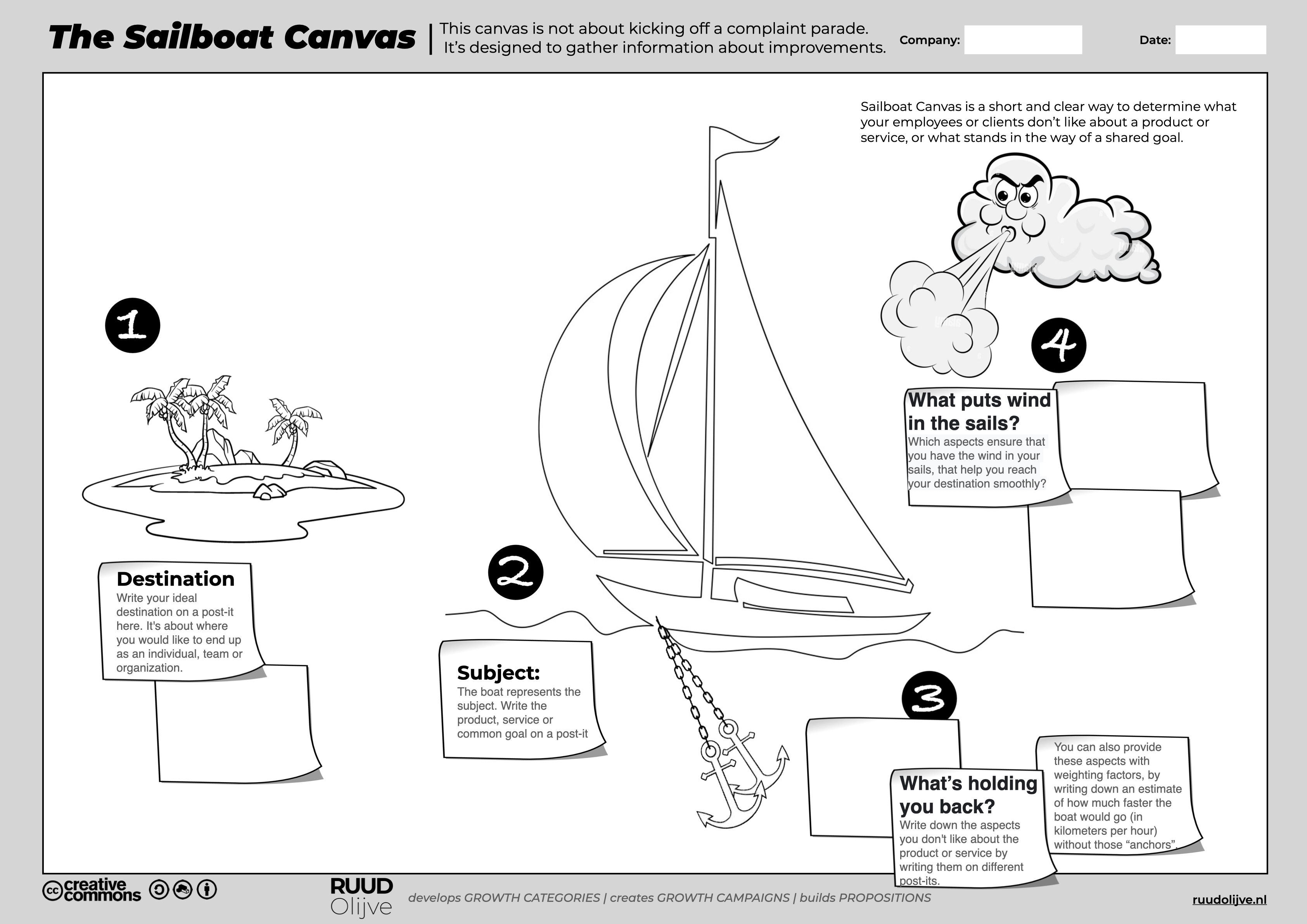 This canvas is not about kicking off a complaint parade.  It’s designed to gather information about improvements. Sailboat Canvas is a short and clear way to determine what your employees or clients don’t like about a product or service, or what stands in the way of a shared goal....